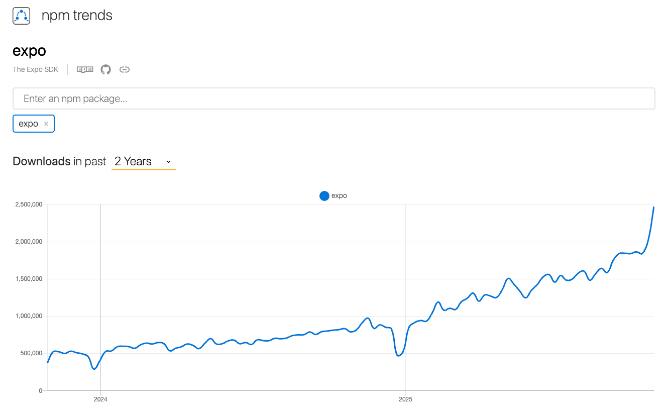 更に、npm trendsで見たところ、直近では更に250万DLまで伸ばしており、1年前から2倍、2年前から比べると5倍以上伸びているようです。 Expo/React Nativeへの注目がここ最近さらに増えているのが分かります。